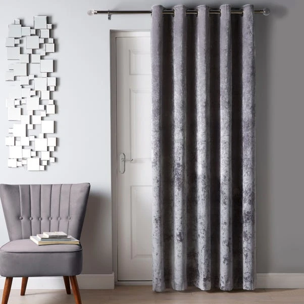 Looking for a luxurious crushed velour door curtain? – we’ve got it right here! Our Crushed Velour Eyelet Door Curtain is made with 100% recycled polyester and available in a choice of sizes. This door curtain is perfect for adding a touch of modern, understated style to any home décor. Made from a luxurious velour fabric for a sophisticated look, with a brushed steel eyelet header and lining for improved privacy and light filtration. Don’t forget to add the coordinating cushion, available to purchase separately!