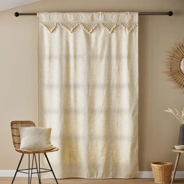 Unleash your inner bohemian with our Macrame Border curtains. These light-filtering voile panels not only bring a soft and diffused light to your space but also infuse it with a touch of global charm. With their hidden tab top design, they’re easy to install and can be used on windows, bifolding doors, or to create separate room panels. Crafted from a luxurious linen blend fabric with intricate macrame detailing, these curtains add a touch of artistry to any room.