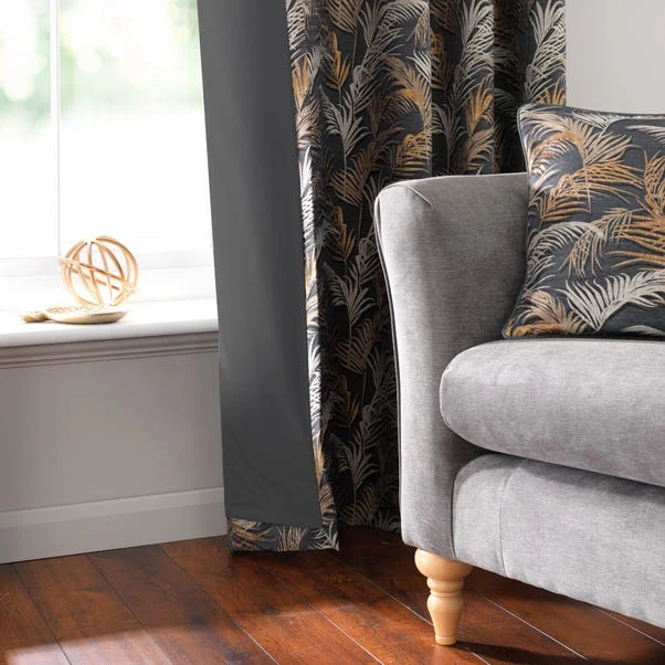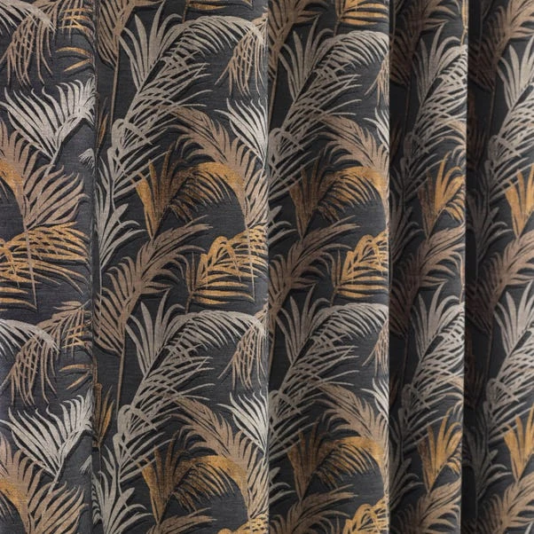 Finished with a palm leaf design on a deep charcoal background this pair of modern eyelet curtains are fully lined and available in a choice of widths and drops.
