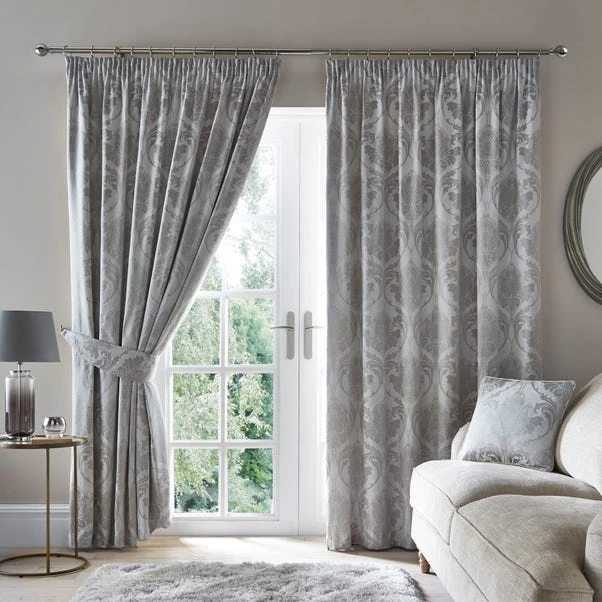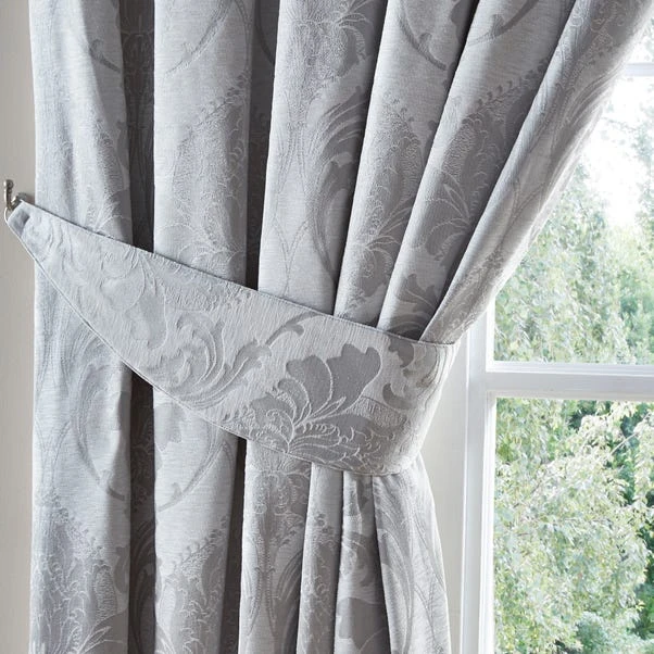 Crafted in a stunning silver colourway in a luxurious chenille jacquard fabric, these damask tiebacks perfectly complement the Zahra silver curtains.